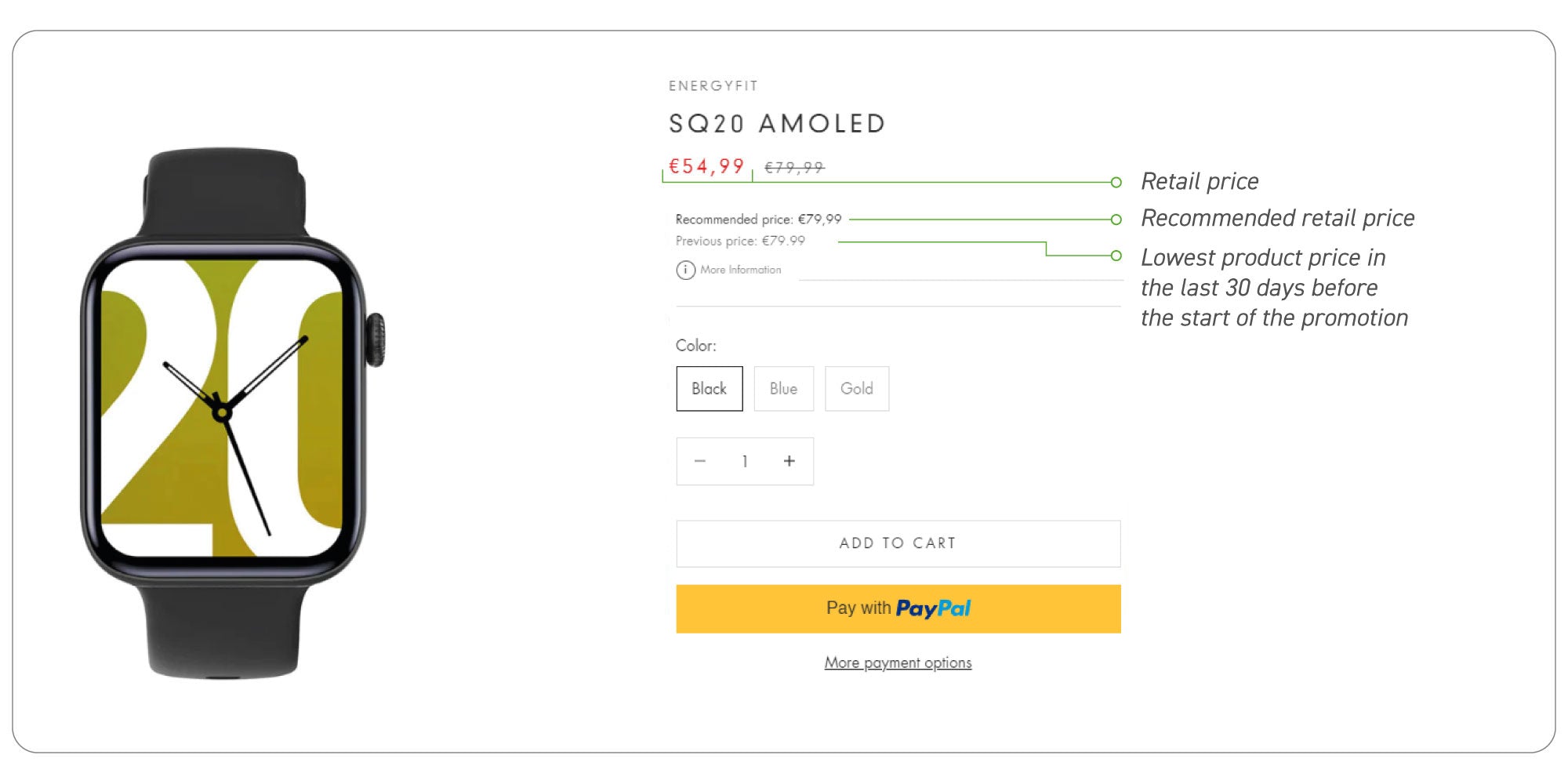 When EnergyFit applies a promotion to products regulated by the Directive, the Previous Price, along with the final price, is displayed as a reference to calculate the discount. Additionally, the Recommended Price is shown to provide a clear comparison with the final price, helping consumers evaluate the offers more transparently.